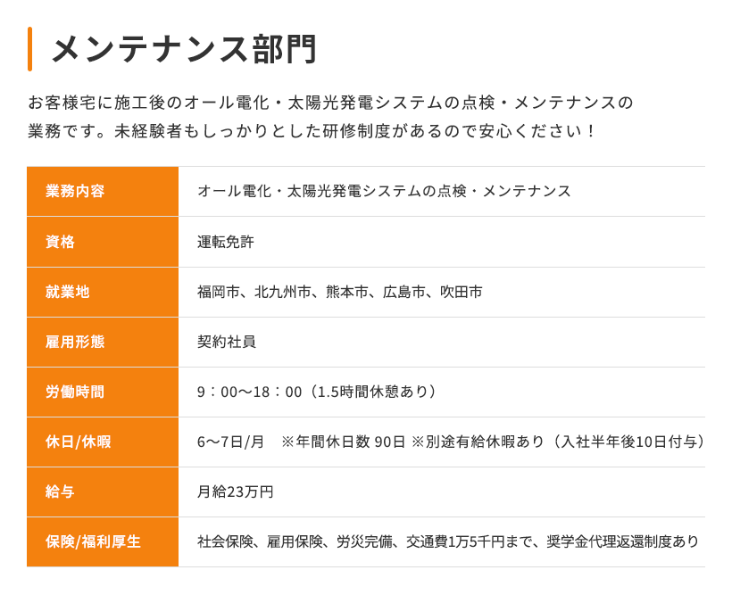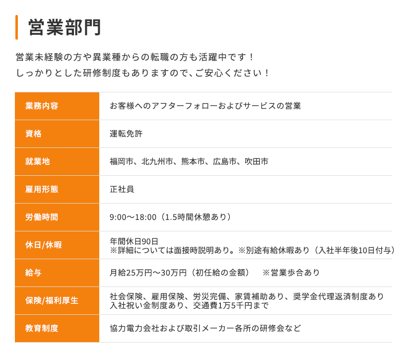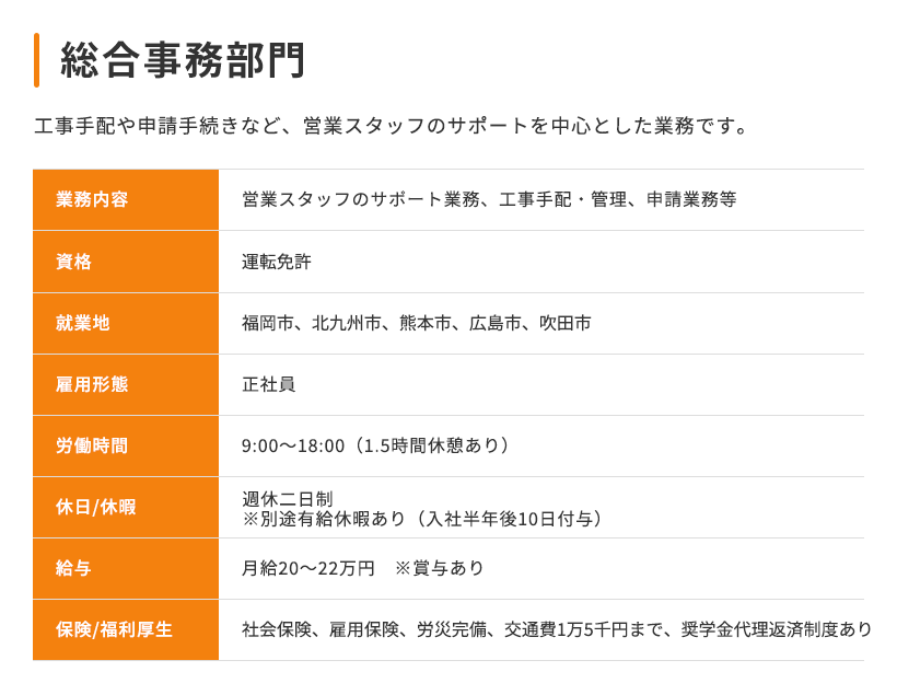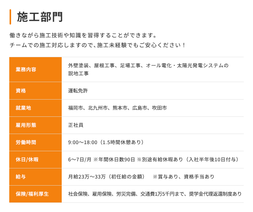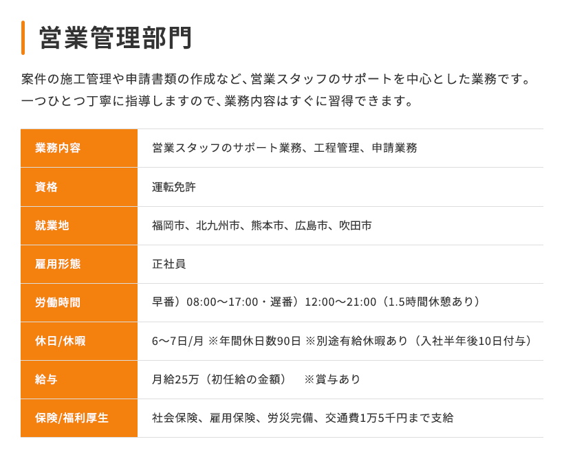 現在当社では、次のステージへの飛躍を一緒にチャレンジしてくれる人を募集しています。 当社にて施工した案件に関し、お客様の立場に立ち、住まいの快適さや便利さ、より充実した住環境を親身に提案できるスタッフを求めています。 仕事に熱くなれ、お客様としっかりコミュニケーションが取れる方なら、異業種からの転職や、営業経験が無くても構いません! また当社の評価制度も頑張った分を評価に反映するシステムで、社員の一生懸命を全力サポートしています。ぜひ私たちと一緒に働いてみませんか?あなたのエントリー心よりお待ちしています!